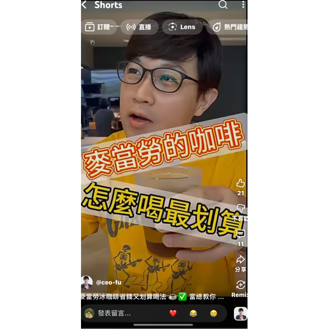 我是品牌主理人富總。在最新的富總觀察室影片中,我實測了麥當勞點餐的一個小秘密:直接點去冰的冰咖啡,量只有約 250cc;但如果你點熱咖啡再跟櫃台要一杯冰塊,自己 DIY,瞬間就能得到一杯近 600cc 的大杯冰咖啡,而且更划算!
