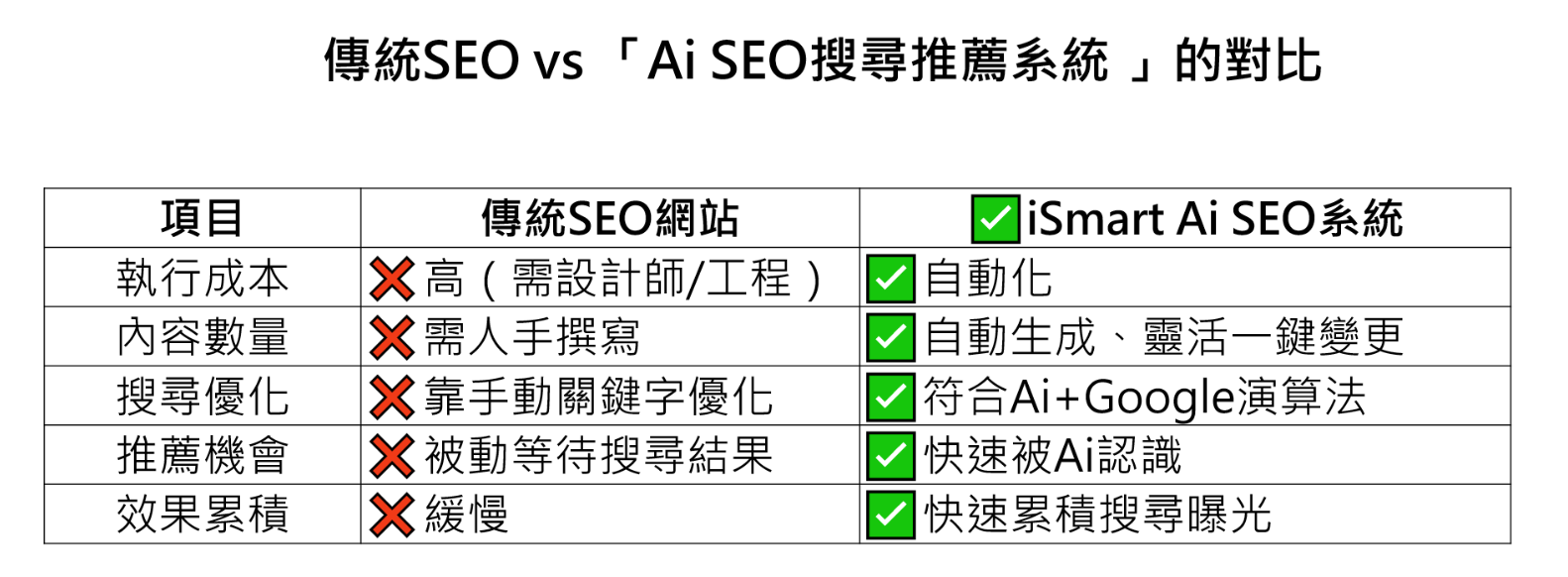 簡單來說,傳統SEO是在「迎合搜尋引擎」,而AISEO是在「真正解決問題」。未來流量的來源,將不只是搜尋排名,而是AI主動推薦。當你的內容被AI信任,自然就會被更多人看見。